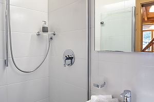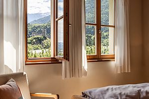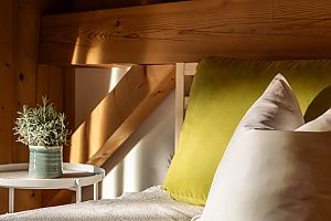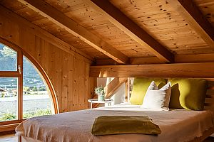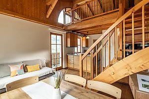 scala in legno per accedere al soppalco con vista panoramica che può avere funzione di camera da letto (2 posti letto) o zona relax, camera con letto matrimoniale, doccia con WC e 2 balconi.