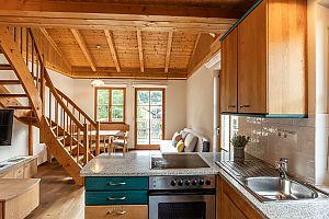 Questo appartamento è dotato di zona soggiorno con cucina, tavolo con panca angolareo, divano letto,
